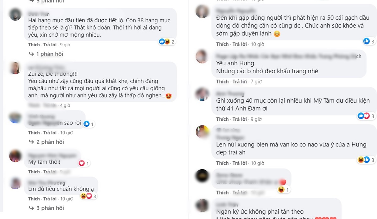 Dòng trạng thái này đã nhận được sự chú ý của khán giả, nhiều người đã để lại bình luận cho rằng Mr.Đàm quá khó tính, thậm chí còn có người ‘ứng cử’ Mỹ Tâm: “Đến khi gặp đúng người thì phát hiện ra 50 cái gạch đầu dòng đó chẳng cần có cũng được. Chúc anh sức khỏe và sớm gặp duyên lành.”