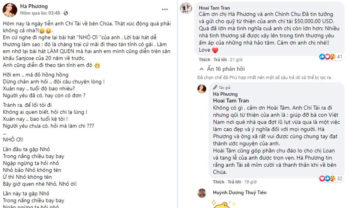 Trước tấm lòng của vợ chồng ca sĩ Hà Phương, một người em thân thiết của Chí Tài là nghệ sĩ Hoài Tâm đã gửi lời cảm ơn ở dưới phần bình luận: “Cảm ơn chị Hà Phương và anh Chính Chu đã tin tưởng và gửi cho quỹ từ thiện của anh chí tài $50,000.00 USD. Quà đã lớn mà tình nghĩa của anh chị còn lớn hơn; Nhiều nhà tình thương sẽ được xây lên trong tình thương yêu ấm áp của những nhà hảo tâm. Cám ơn anh chị nhé!! Love”.
