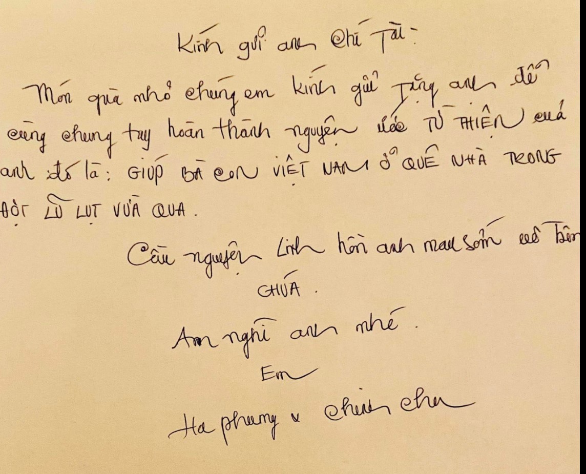 Trước lời cảm ơn của đàn em, Hà Phương cũng vô cùng xúc động chia sẻ tấm lòng của mình: “Không có gì, cảm ơn Hoài Tâm. Anh Chí Tài ra đi nhưng quỹ từ thiện của anh là giúp đỡ bà con Việt Nam nơi quê nhà qua đợt lũ lụt vừa qua là một việc làm cao đẹp và ý nghĩa đối với mọi người. Hà Phương và ông xã rất vui được cùng chung tay đạt thành ước nguyện của anh.