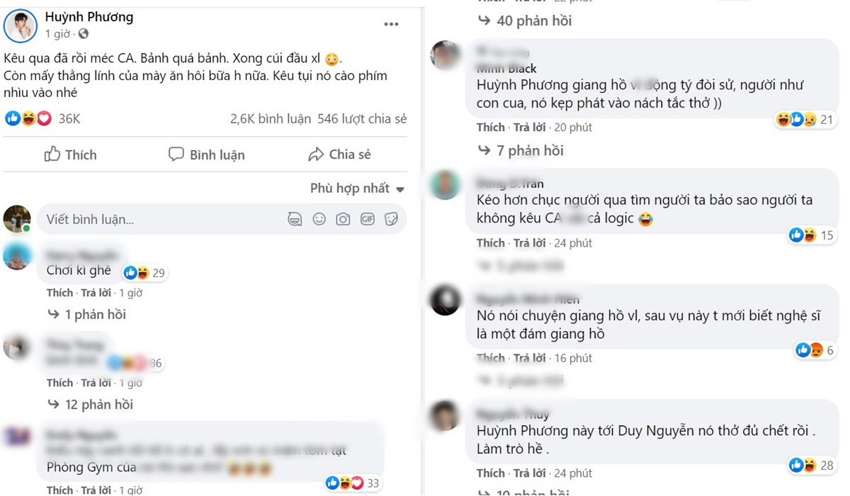 Đáng nói, vào trưa 14/12, nam diễn viên Huỳnh Phương đã đăng tải dòng trạng thái tiết lộ về tình hình cuộc chất vấn sáng nay: “Kêu qua đã rồi méc CA. Bảnh quá bảnh. Xong cúi đầu xin lỗi. Còn mấy thằng lính của mày ăn hôi bữa giờ nữa. Kêu tụi nó cào phím nhiều vào nhé!”