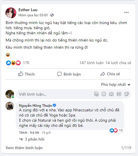Chia sẻ hài hước của Hari Won ngay lập tức nhận được sự chú ý của khán giả và bạn bè. Vinh Râu bất ngờ tiết lộ rằng vợ mình cũng có thói quen y chang đàn chị: "Ui da, vợ em với em y chang...Bà hay mở tiếng sóng vỗ rì rào.... chim hót. Em ngủ không nổi". Nhạc sĩ Nguyễn Hồng Thuận cũng cho biết mình có chung thói quen của Hari Won: "Anh cùng đội với em nha. Vào app...vô chỗ chủ đề nó có cái chủ đề Yoga hoặc Spa. Em chọn cái Natural và hẹn giờ rồi ngủ thôi. Anh cũng phải nghe mấy cái này cho dễ ngủ đó bé".
