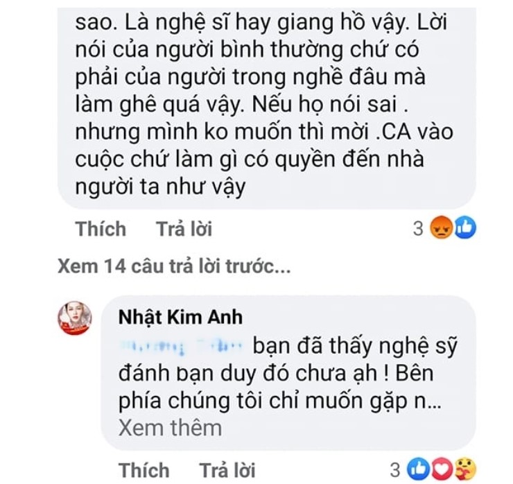 Trước sự chỉ trích này, Nhật Kim Anh bất ngờ đáp trả đanh thép: “Bạn đã thấy nghệ sĩ đánh bạn đó chưa ạ? Bên phía chúng tôi chỉ muốn gặp nói chuyện".