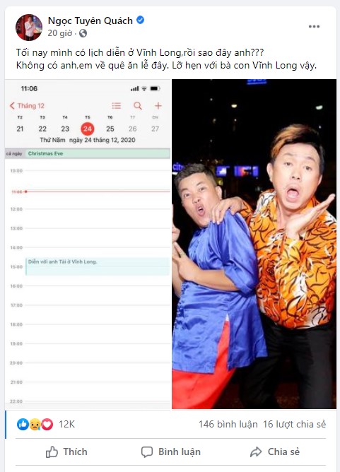Vào ngày 24.12, nam diễn viên Quách Ngọc Tuyên đau lòng khi gửi nhắn nhủ đến cố nghệ sĩ Chí Tài: "Tối nay mình có lịch diễn ở Vĩnh Long, rồi sao đây anh? Không có anh, em về quê ăn lễ đây. Lỡ hẹn với bà con Vĩnh Long vậy".