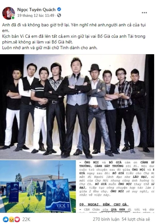 Quách Ngọc Tuyên từng nghẹn ngào chia sẻ trên trang cá nhân vào ngày diễn ra tang lễ của cố danh hài diễn ra ở Mỹ: "Anh đã đi và không bao giờ trở lại. Yên nghỉ nhé anh, người anh cả của tụi em. Kịch bản Vi Cá em đã lên tất cả, em xin giữ lại vai Bố Già của anh Tài trong phim, sẽ không ai làm vai Bố Già hết. Luôn nhớ anh và giữ mãi chữ "tình" dành cho anh".