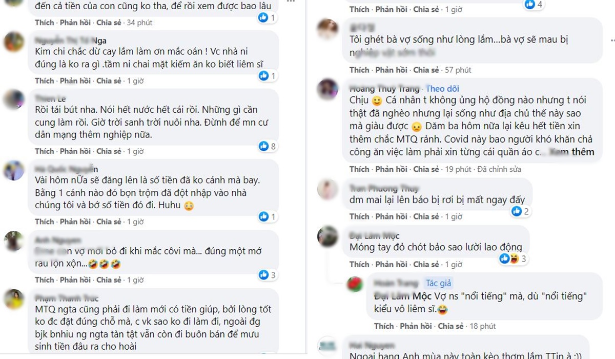 MTQ người ta cũng phải đi làm mới có tiền giúp, bởi lòng tốt không được đặt đúng chỗ mà, vợ chồng sao không đi làm đi, ngoài đường có biết bao nhiêu người tàn tật vẫn còn đi buôn bán để mưu sinh tiền đâu ra cho hoài!”