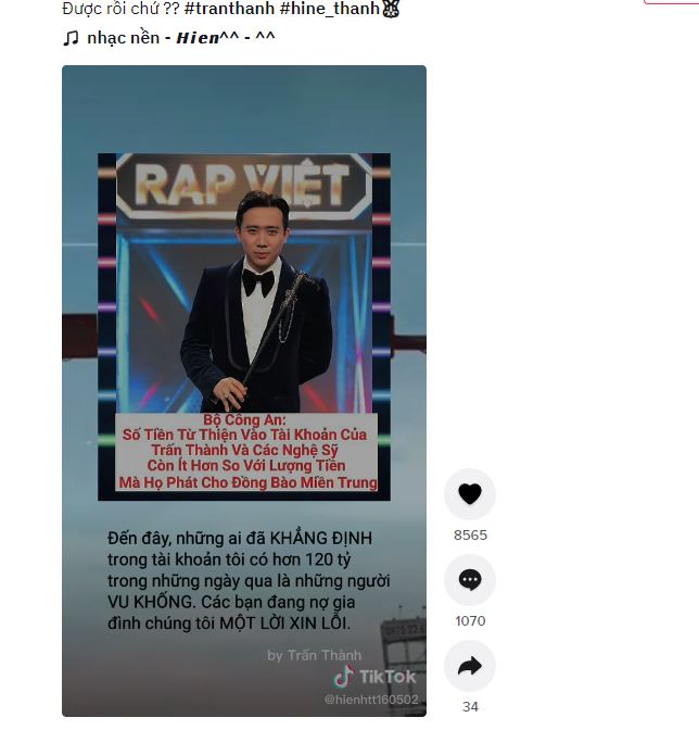 Sau khi Cục Cảnh sát hình sự (C02) thông tin mới liên quan đến vụ từ thiện, nhiều fan đã ngay lập tức lên tiếng ‘đòi công bằng’ cho nghệ sĩ. Trong đó, fan của Trấn Thành đã lan truyền đoạn clip với nội dung xót xa cho những gì nam MC đã phải chịu đựng trong thời gian qua, thậm chí còn nhắc lại phát ngôn của nam nghệ sĩ khi công khai bản sao kê.