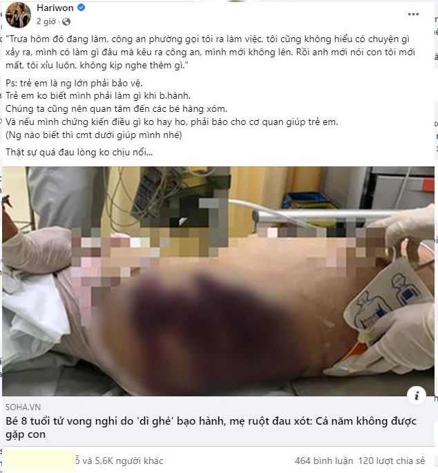 Mới đây, trên trang cá nhân của Hari Won, nữ ca sẽ chia sẻ bài đăng mới nhất khuyên mọi người nên báo công an khi bắt gặp trường hợp thấy trẻ em bị bạo hành để tránh những vụ việc thương tâm tương tự xảy ra. Cụ thể người đẹp đã trích dẫn lời người mẹ của nạn nhân khi hay tin con ruột mình đã qua đời vì bị bạo hành: “"Trưa hôm đó đang làm, công an phường gọi tôi ra làm việc, tôi cũng không hiểu có chuyện gì xảy ra, mình có làm gì đâu mà kêu ra công an, mình mới không lên. Rồi anh mới nói con tôi mới mất, tôi xỉu luôn, không kịp nghe thêm gì."