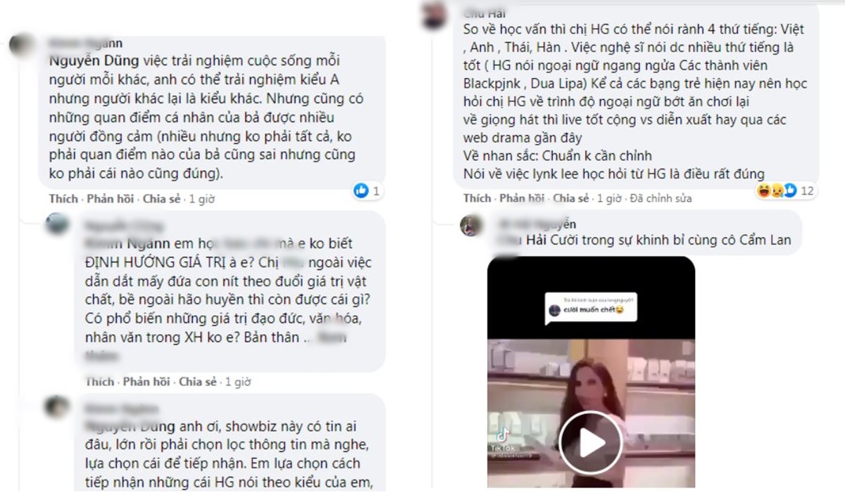 "So về học vấn thì chị HG có thể nói rành 4 thứ tiếng: Việt , Anh , Thái, Hàn . Việc nghệ sĩ nói được nhiều thứ tiếng là tốt ( HG nói ngoại ngữ ngang ngửa Các thành viên Blackpink, Dua Lipa). Kể cả các bạn trẻ hiện nay nên học hỏi chị HG về trình độ ngoại ngữ bớt ăn chơi lại.Về giọng hát thì live tốt cộng với diễn xuất hay qua các web drama gần đây."