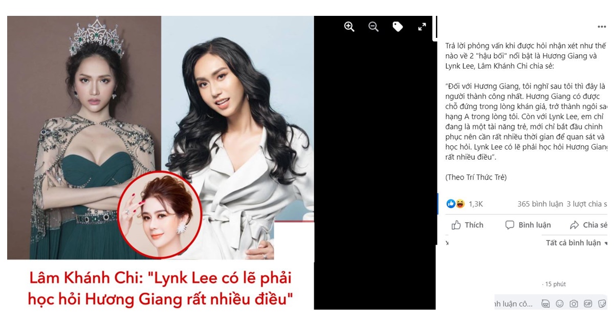 Mới đây, trong một group kín về giải trí có hàng nghìn thành viên đăng tải câu trả lời tại một buổi phỏng vấn của Lâm Khánh Chi khi được hỏi nhận xét như thế nào về 2 "hậu bối" nổi bật là Hương Giang và Lynk Lee, Lâm Khánh Chi chia sẻ: