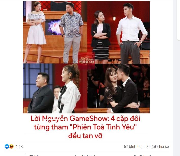 Cụ thể trong một group chuyên bàn về chuyện showbiz có tới hàng trăm ngàn thành viên đã bất ngờ chia sẻ về ‘lời nguyền’ của các cặp đôi đẹp trong Vbiz khi cùng tham gia chung vào Gameshow ‘phiên tòa tình yêu’ đều đã đường ai nấy đi.