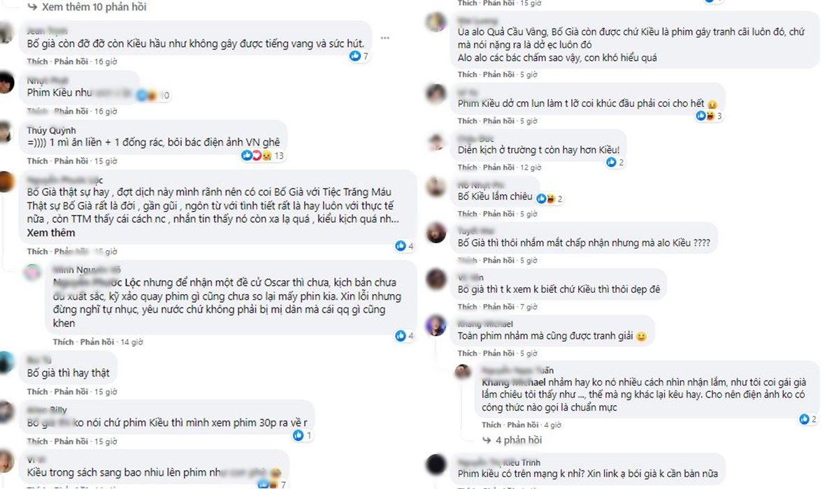 Bên cạnh đó, ngay giữa hai bộ phim Bố già và Kiều khán giả cũng đặt ra so sánh, cho thấy sự chênh lệch rất lớn: “Nghĩ sao Kiều đi tranh giải vậy? Bố già tuy mô típ hơi cũ, không đặc biệt, nhưng ít ra còn xem được chứ cho phim Kiều là không ai hiểu luôn”, “Bố già đi tranh thì được. Còn cái phim Kiều chắc cụ Nguyễn Du xem cũng tức nữa mà sao cho đi thi”...