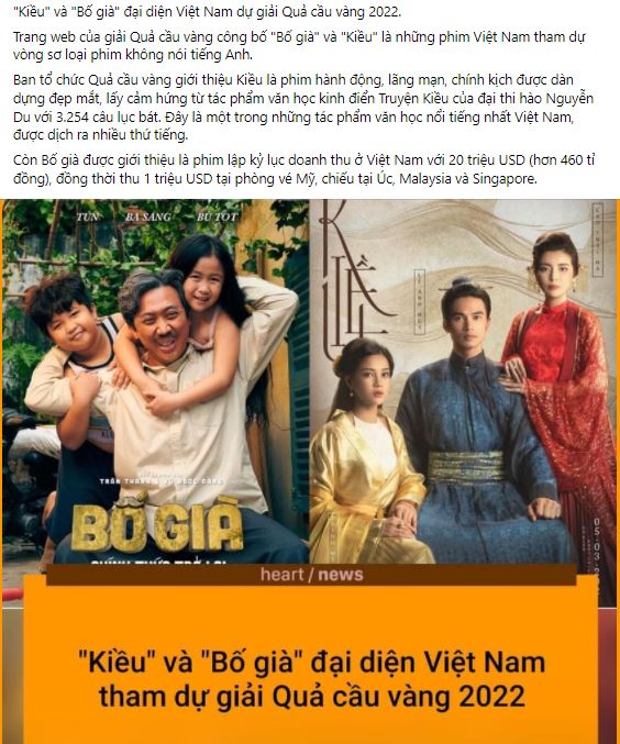 Vừa qua, trên trang web chính thức của giải thưởng điện ảnh Quả cầu vàng 2022 vừa công bố danh sách các tác phẩm đứng ra tranh tài tại hạng mục "Phim nói tiếng nước ngoài xuất sắc nhất". Bất ngờ, hai đại diện của Việt Nam là Bố già (đạo diễn: Trấn Thành, Vũ Ngọc Đãng) và Kiều (đạo diễn: Mai Thu Huyền) cũng nằm trong danh sách tranh cử.