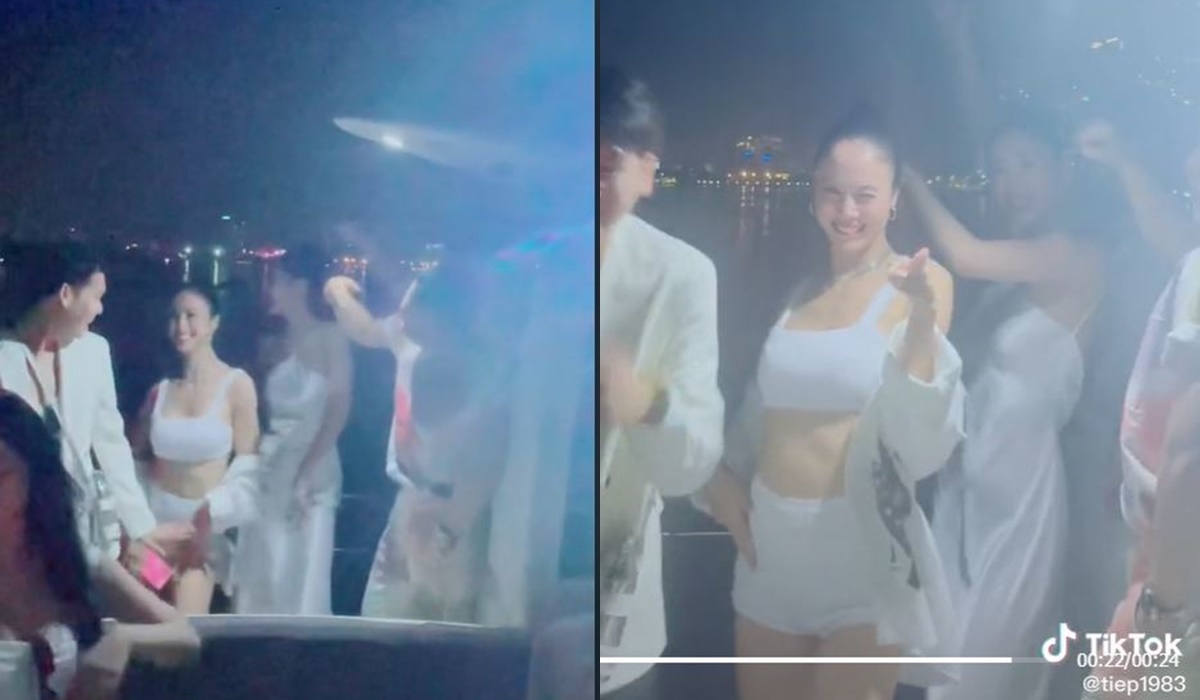 Đáng nói điệu nhảy của gợi cảm khi để áo hứng hờ của Ngọc Anh đã được zoom cận cảnh khiến cô càng nóng bỏng. Buổi tiệc 'đu đưa' trên du thuyền của Vũ Khắc Tiệp khiến dân tình 'nóng mắt' vì được chứng kiến tận mắt sự quyến rũ 'hết nấc' của dàn chân dài.