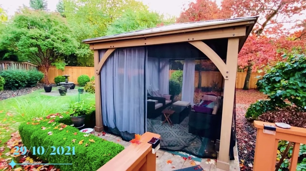 Theo trong ảnh nam ca sĩ chia sẻ, anh trồng nhiều cây xanh tạo tạo không gian thoáng mát. Không chỉ vậy, ngoài ra trong khuôn viên có trạm lầu nghỉ để cả nhà ngồi thư giãn. Vào mùa thu, những chiếc lá phong rơi đầy sân nhà nam ca sĩ và tạo nên một không gian vô cùng lãng mạn, trữ tình.