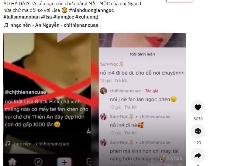 Điều này đã làm nổ ra một cuộc chiến quá khích giữa fan hai bên. Đỉnh cao là 1 tài khoản trên tiktok còn chê fan của Lan Ngọc phèn. Vụ việc tiếp tục được đẩy đến cao trào một lần nữa khi fan của Lan Ngọc chứng minh cô nàng không hề kém cạnh Lisa ở phương diện nào khi Lan Ngọc được đánh giá trong Top 5 “nữ thần” nổi tiếng nhất Đông Nam Á.