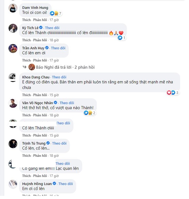 Rất nhiều người thân, đồng nghiệp, bạn bè đã gửi lời động viên dưới bài đăng của Phạm Chí Thành mong anh lấy lại niềm tin và có kỳ tích xuất hiện: "Cố lên em ơi, không được bỏ cuộc, mọi người đang chờ em khoẻ lại", "Cố lên Thành ơi , mong em sớm bình phục và khỏe mạnh nhé em", "Cố lên bạn ơi, suy nghĩ lạc quan là mình sẽ qua khỏi nha",...