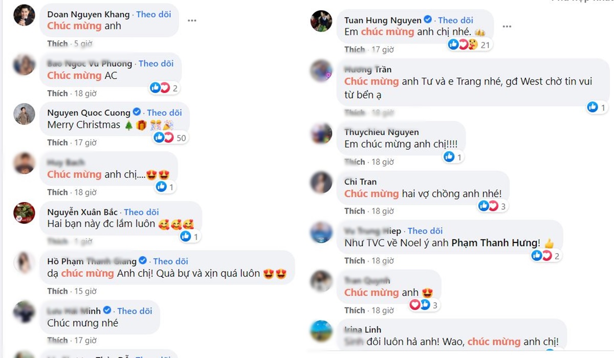 Dưới bài đăng, một loạt cư dân mạng và người thân thiết của vị tỷ phú này đã gửi lời chúc mừng tới hai vợ chồng như Cường Đô la, MC Nguyên Khang, Tuấn Hưng, NS Xuân Bắc…