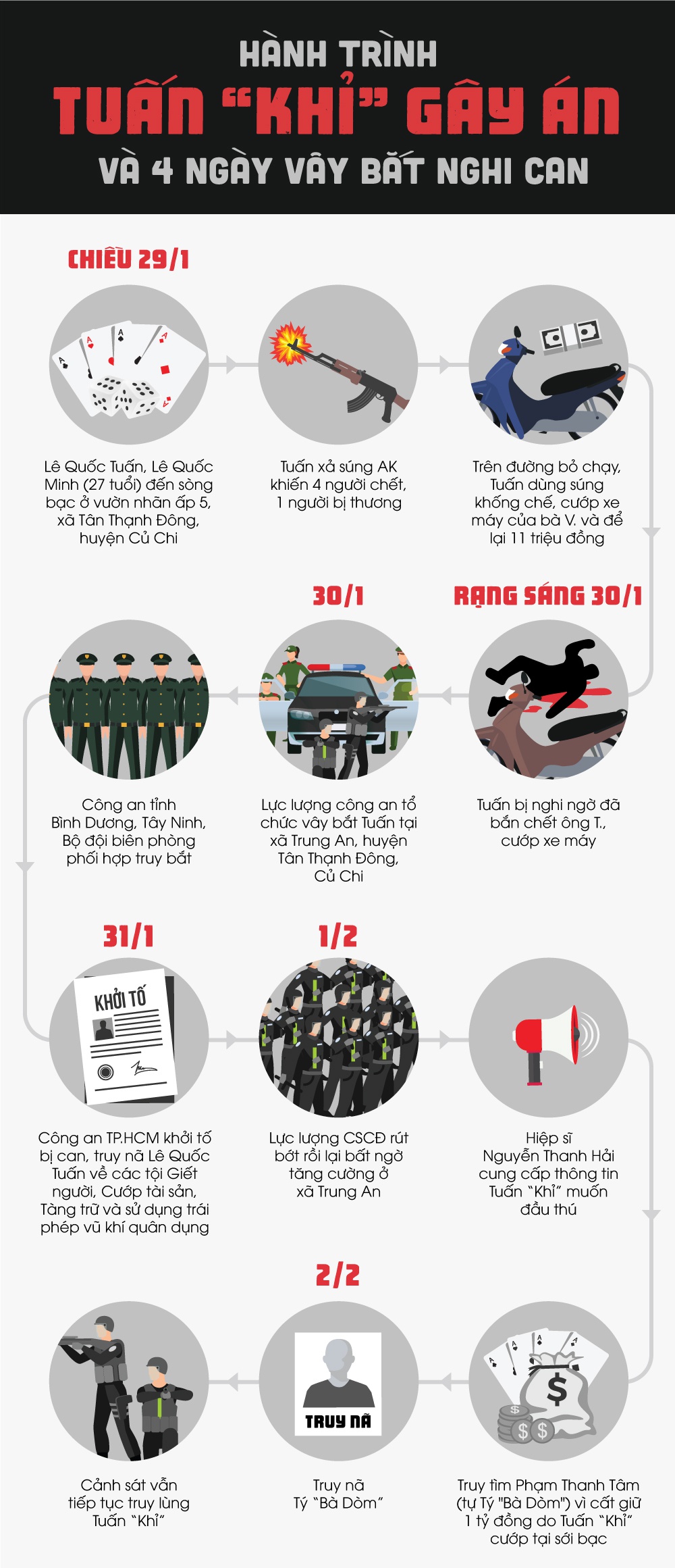 Vào chiều 29/1 (mùng 5 Tết Canh Tý), Lê Quốc Tuấn cùng với em họ là Lê Quốc Minh (27 tuổi, ngụ xã Tân Thạnh Đông, huyện Củ Chi) đã đi xe máy đến sới bạc ở vườn nhãn thuộc ấp 5, xã Tân Thạnh Đông, huyện Củ Chi, TP.HCM, chơi lắc tài xỉu. Sau khi thua bạc, Tuấn đã bỏ đi và quay trở lại với khẩu AK, nổ súng vào sới bạc. Sau khi các con bạc chạy thục mạng, Tuấn "Khỉ" cướp khoảng 1 tỷ đồng rồi lên xe máy SH chạy khỏi hiện trường, bỏ lại 4 người chết tại chỗ, 1 người bị thương và làm chết một con bò sữa của hộ dân gần đó.
