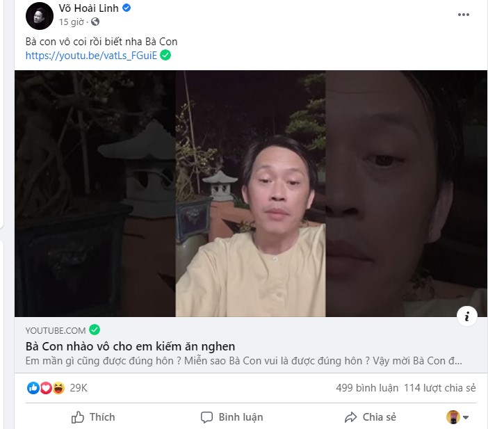 Đáng mừng hơn nữa là vào tối ngày 7/2, Hoài Linh đã chia sẻ lên trang cá nhân một đường link Youtube với tiêu đề đầy tính mời gọi: “Bà con nhào vô cho em kiếm ăn nha!”. Theo đó trong clip, Hoài Linh đã xuất hiện vô cùng vui vẻ và chia sẻ: “Bà con cô bác ơi, em mới vừa tạo cái kênh Youtube của em. Từ xưa tới giờ cũng có rồi nhưng bây giờ là em thử em tự tạo. Nếu mà bà con thương em á, do subscribe (đăng ký) gì đó, đăng ký kênh cho em, mai mốt em xàm cho mấy bà con coi. Ta nói nhiều cái xàm giữ lắm mà không nói được nó ức chế gì đâu à.”