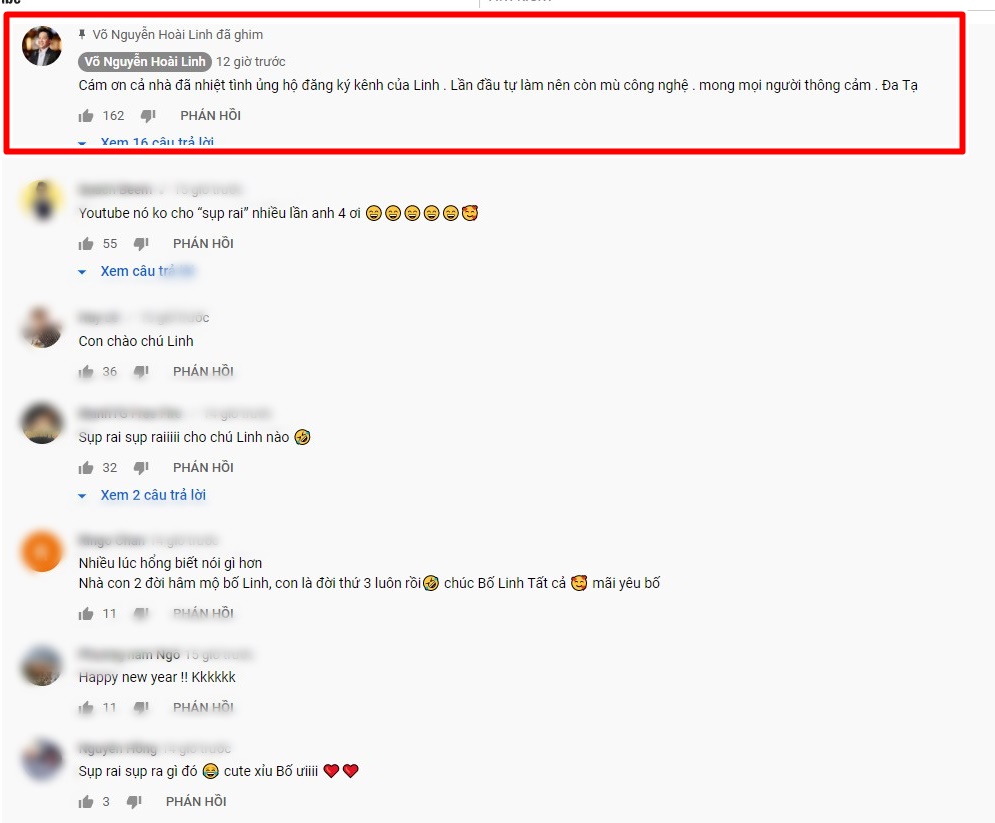 Nhận được tình cảm và sự ủng hộ nhiệt tình của khán giả, Hoài Linh cũng xúc động để lại bình luận cảm ơn mọi người: “Cám ơn cả nhà đã nhiệt tình ủng hộ đăng ký kênh của Linh. Lần đầu tự làm nên còn mù công nghệ . mong mọi người thông cảm. Đa Tạ!”