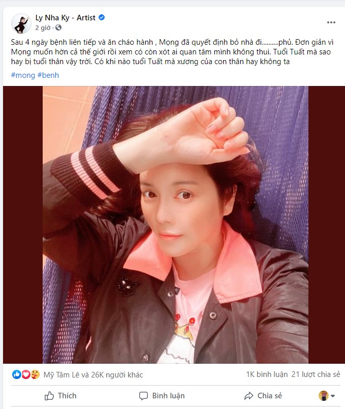 Theo đó, Lý Nhã Kỳ cho biết cô đã bị ốm suốt 4 ngày liên tiếp và chỉ được ăn cháo hành. Nữ diễn viên còn nói đùa rằng điều này đã khiến cô phải ‘bỏ nhà ra đi’ để xem ai có còn xót xa, yêu thương mình không. Chia sẻ vừa đáng yêu vừa đáng thương của Lý Nhã Kỳ đã nhận về được sự chú ý của khán giả.