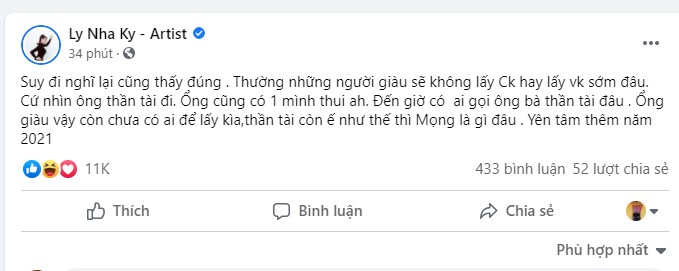 Chưa hết, vào ngày 21/2, mồng 10 âm - ngày vía thần tài, Lý Nhã Kỳ lại tiếp tục có sự liên hệ tới tình trạng độc thân của mình. Theo đó, nữ diễn viên cho rằng những người nhiều tiền sẽ không lấy chồng hay lấy vợ sớm. Cô còn đưa ‘ông Thần Tài’ ra làm ví dụ để minh chứng cho cô gái này. Lý Nhã Kỳ chia sẻ đầy hài hước: “Suy đi nghĩ lại cũng thấy đúng. Thường những người giàu sẽ không lấy Chồng hay lấy vợ sớm đâu. Cứ nhìn ông thần tài đi. Ổng cũng có 1 mình thui ah. Đến giờ có ai gọi ông bà thần tài đâu. Ổng giàu vậy còn chưa có ai để lấy kìa,thần tài còn ế như thế thì Mọng là gì đâu . Yên tâm thêm năm 2021!’