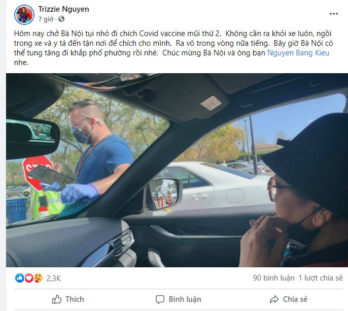 Vợ cũ Bằng Kiều chia sẻ về việc dẫn mẹ chồng cũ đi tiêm vắc-xin: “Hôm nay chở Bà Nội tụi nhỏ đi chích covid vacxin mũi thứ 2. Không cần ra khỏi xe luôn, ngồi trong xe và y tá đến tận nơi để chích cho mình. Ra vô trong vòng nửa tiếng.