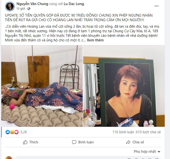 Nam nhạc sĩ thông báo tình trạng nghiêm trọng của nghệ sĩ Hoàng Lan và đăng đàn kêu gọi sự giúp đỡ, ủng hộ từ mọi người để nữ nghệ sĩ phần nào trang trải cho chi phí thuốc thang thang cũng như chi phí sinh hoạt: