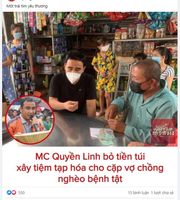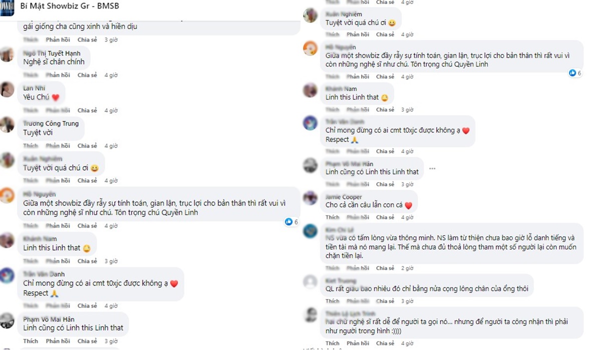 Ngoài ra, ở phần bình luận vẫn xuất hiện nhừng bình luận có ngụ ý so sánh Quyền Linh với 1 nghệ sĩ đình đám khác là NS Hoài Linh. Theo đó, nếu như Quyền Linh được người hâm mộ ưu ái đặt biệt danh “MC từ thiện” khi liên tục xây dựng hình ảnh đẹp, bỏ cả tiền túi để giúp đỡ người nghèo thì hình ảnh Hoài Linh trong những năm gần đây xuống dốc không phanh sau vụ lùm xùm kêu gọi từ thiện miền trung.