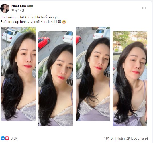 Mới đây, vào trưa ngày 20/2, Nhật Kim Anh bất ngờ đăng tải hình ảnh diện đồ ngủ, khoe trọn vẹn nhan sắc trẻ trung trên cá nhân khiến cộng đồng mạng bất ngờ vì quá xinh đẹp. Cụ thể người đẹp đăng tải kèm dòng trạng thái “Phơi nắng … hít không khí buổi sáng… Buổi trưa up hình… zị mới shock hị hị”.