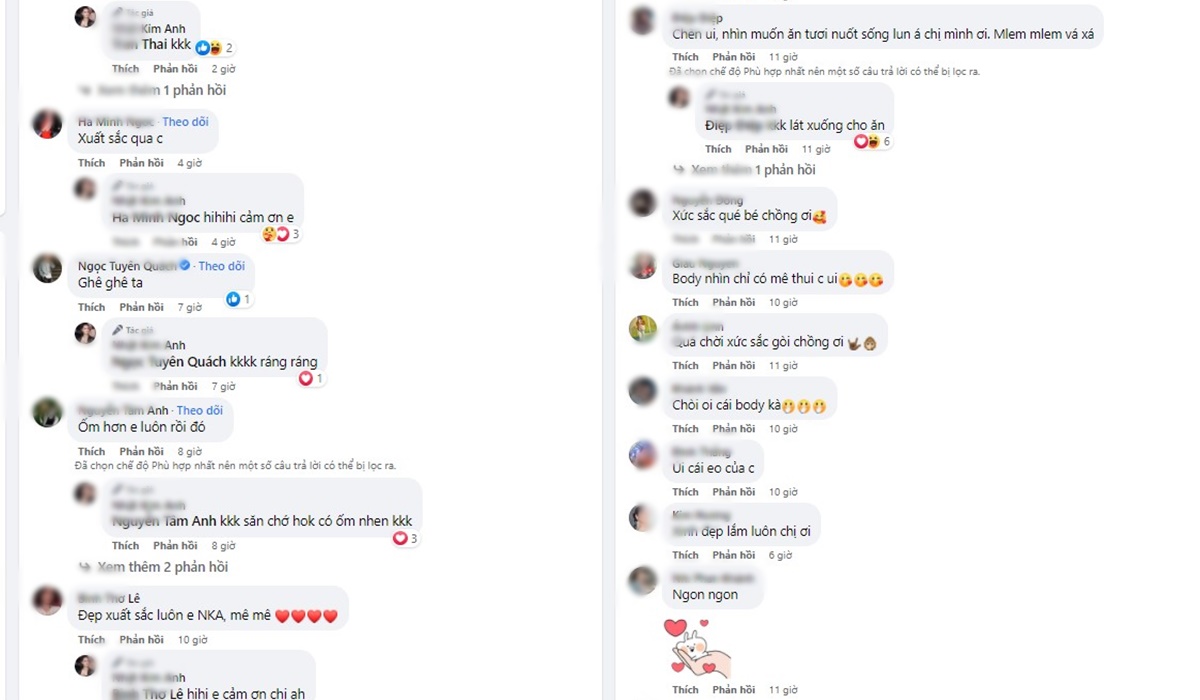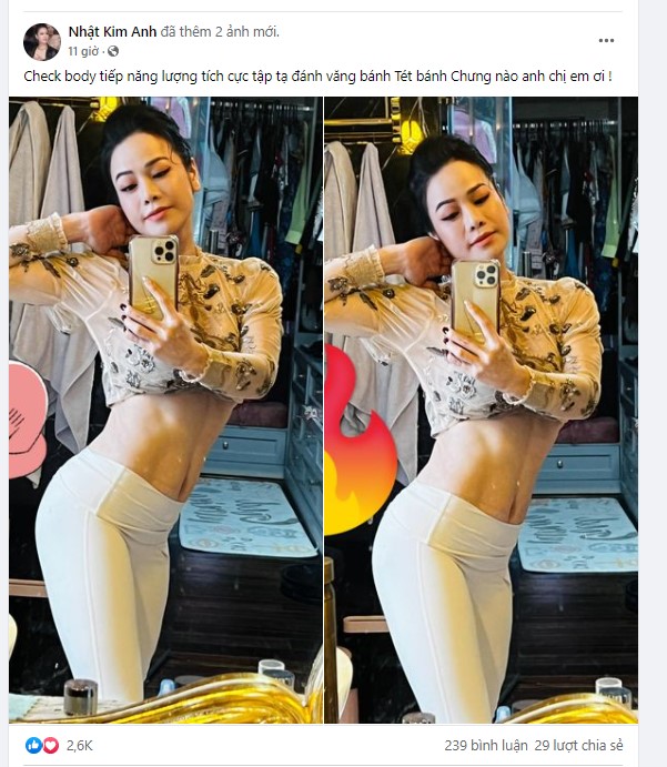 Ngay sau khi được đăng tải vài giờ, bức hình Nhật Kim Anh mặc quần bó sát rạt, vén áo khoe trọn cơ bụng săn chắc trước gương, thu hút hàng ngàn lượt tương tác với hàng trăm bình luận. Đặc biệt, vòng 2 săn chắc của Nhật Kim Anh mới là tâm điểm của sự chú ý, ai nấy khen ngợi trước các 'múi cơ bụng' của bà mẹ 1 con: