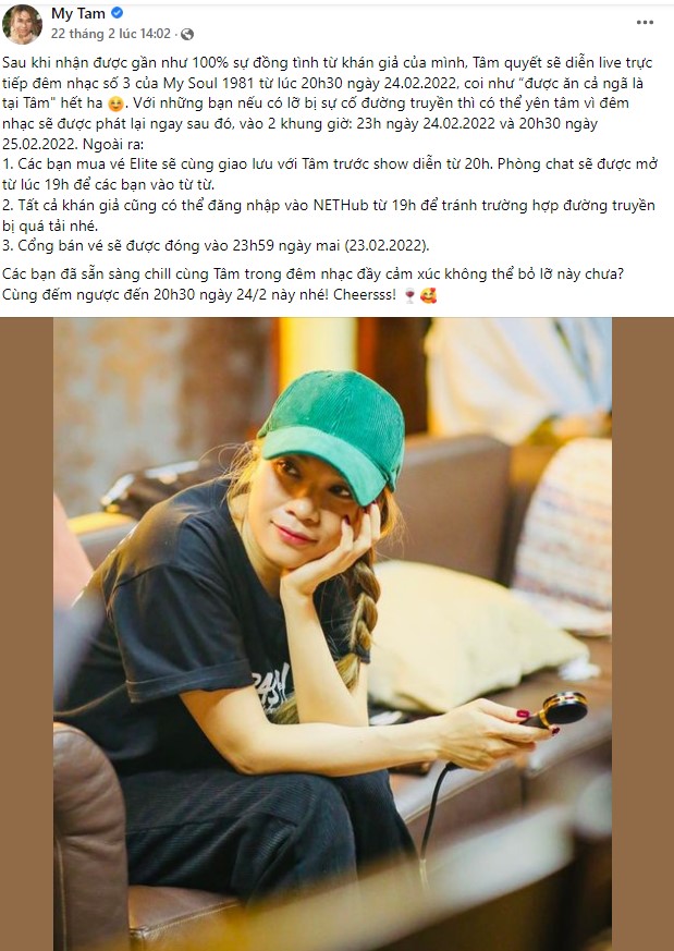 "Sau khi nhận được gần như 100% sự đồng tình từ khán giả của mình, Tâm quyết sẽ diễn live trực tiếp đêm nhạc số 3 của My Soul 1981 từ lúc 20h30 ngày 24.02.2022, coi như “được ăn cả ngã là tại Tâm" hết ha. Với những bạn nếu có lỡ bị sự cố đường truyền thì có thể yên tâm vì đêm nhạc sẽ được phát lại ngay sau đó, vào 2 khung giờ: 23h ngày 24.02.2022 và 20h30 ngày 25.02.2022. Ngoài ra: