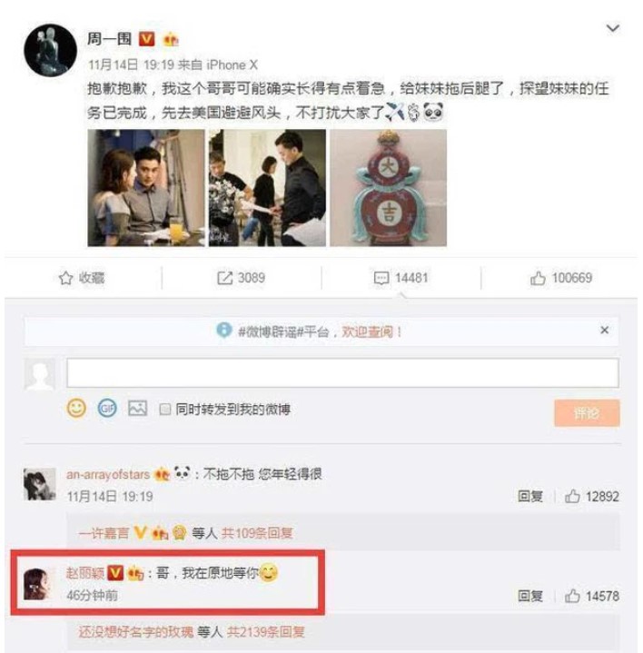 Chu Nhất Vi từng vào vai anh trai của Triệu Lệ Dĩnh trong phim “Thời Gian Tươi Đẹp Của Anh Và Em”. Bộ phim nhận về khá nhiều ý kiến trái chiều về vai diễn của Chu Nhất Vi ngay khi vừa phát sóng. Thời điểm đó, Triệu Lệ Dĩnh lên tiếng bênh vực cho Chu Nhất Vi và cổ vũ tinh thần cho đàn anh.