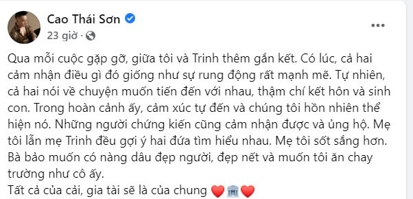 Mới đây, Cao Thái Sơn khiến người hâm mộ bất ngờ và bàn tán khi cho biết đang tìm hiểu và có ý định tiến tới hôn nhân nữ diễn viên Angela Phương Trinh. Nếu đây là sự thật thì ước tính khối tài sản chung của cặp đôi sẽ vô cùng khổng lồ khi nam ca sĩ đã tuyên bố: "Tất cả của cải, gia tài sẽ là của chung”. Hiện tại, thông tin này vẫn đang khiến dư luận bàn tán xôn xao.