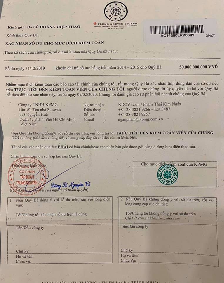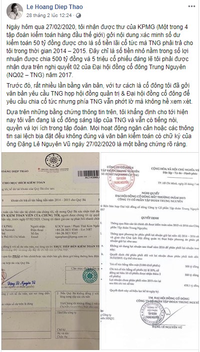 “Ngày hôm qua 27/02/2020, tôi nhận được thư của KPMG (Một trong 4 tập đoàn kiểm toán hàng đầu thế giới) gởi nội dung xác minh số dư kiểm toán 50 tỷ đồng được cho là số tiền lãi cổ tức mà TNG phải trả cho tôi trong thời gian 2014 – 2015. Đây chỉ là số tiền nhỏ nằm trong số lợi nhuận được chia 500 tỷ đồng và 5 triệu cổ phiếu đáng lẽ tôi phải được nhận dựa trên nghị quyết 02 của Đại hội đồng cổ đông Trung Nguyên (NQ02 – TNG) năm 2017.