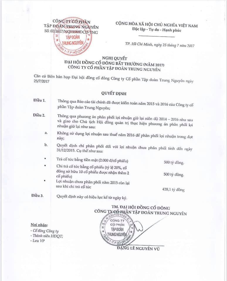 Theo đó, bà đã đưa ra bằng chứng bằng văn bản kiểm toán có chữ ông Đặng Lê Nguyên Vũ ngày 27/02/2020 để nói về quyền lợi chia cổ tức mà đáng lẽ bà phải nhận được lên tới 500 tỷ đồng và 5 triệu cổ phiếu. Liên quan đến vấn đề này, hiện tại phía Trung Nguyên vẫn chưa có xác nhận chính thức. Mặc dù cuộc hôn nhân của vợ chồng Trung Nguyên đã đi đến hồi kết, nhưng những tranh cãi về việc chia quyền lợi vẫn chưa bao giờ nguôi khi bà Thảo hết lần này đến lần khác khẳng định vai trò và quyền hạn của mình ở Trung Nguyên.