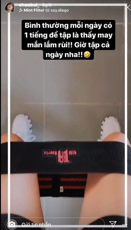 Có vẻ như, khi vào khu cách ly, trang cá nhân dường như là công cụ hữu ích để Châu Bùi "giết thời gian" cũng như tương tác với thế giới bên ngoài. Trong vòng một ngày, cô nàng nãy đã đăng gần 10 tấm ảnh "thông báo hoạt động " trên story của Instagram. Theo như những gì mà Châu Bùi đã chia sẻ, thì cô có một không gian cách ly sạch sẽ thoáng mát với những bữa ăn ngon cùng đồ ăn người thân gửi vào. Ngoài ra cô dành thời gian tập thể dục và vệ sinh phòng ở cá nhân. Mới đây nhất, cô nàng còn edit những bức ảnh của mình để tạo tương tác với người hâm mộ.