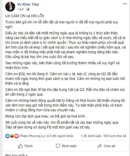 Cụ thể, Vũ Khắc Tiệp thông báo kết quả âm tính với virus Corona sau khi xét nghiệm, anh cũng bày tỏ lời xin lỗi và cảm ơn đến các cơ quan chức năng cũng như CĐM. Có vẻ như ông Bầu đã nhận ra vấn đề mà mình đã mắc phải trong những ngày qua đồng thời ghi nhận đây là bài học lớn cho cả cuộc đời mình. Với những biến cố này, ông bầu tuyên bố sẽ dừng sử dụng Facebook một thời gian để bình tâm trở lại.