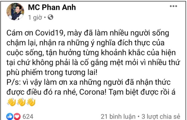 Mới đây, MC Phan Anh vừa đăng tải những suy nghĩ của mình xung quanh đại dịch Covid-19. Tuy nội dung của bài viết có ý cầu mong dịch bệnh mau qua đi để trả lại cuộc sống bình thường cho mọi người nhưng cách dùng từ của MC “thị phi” này đã gây ra không ít sự khó chịu cho người đọc.