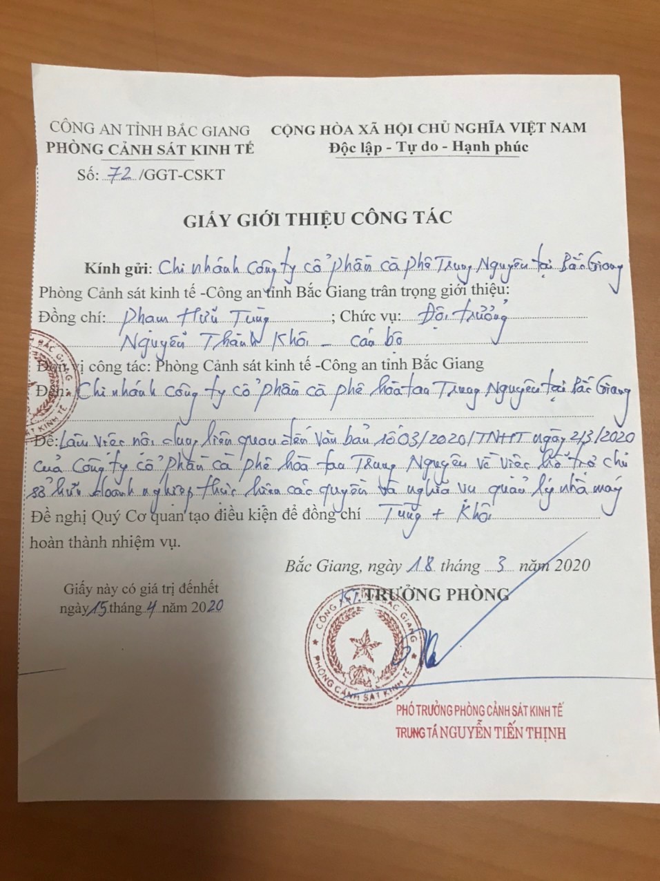 Trước đó, vào ngày 19/3 Công an kinh tế tỉnh Bắc Giang đã đến Nhà máy cà phê hòa tan chi nhánh Bắc Giang của bà Thảo để yêu cầu cung cấp một số thông tin liên quan. Theo đó, giấy giới thiệu công tác từ phòng cảnh sát kinh tế ghi rõ các cán bộ được cử đến để: “Làm việc nội dung liên quan đến văn bản số 03/2020TNHT ngày 2/3/2020 của Công ty cổ phần cà phê hòa tan Trung Nguyên, về việc hỗ trợ chủ sở hữu doanh nghiệp thực hiện các quyền và nghĩa vụ quản lý nhà máy.