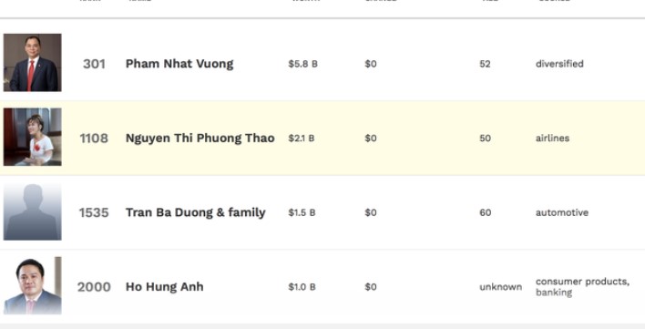 Theo số liệu cập nhật realtime bảng xếp hạng danh sách các tỷ phú đô la của Forbes, tính đến ngày 5/3/2020, khối tài sản của các tỷ phú Việt Nam với nhiều biến động. Theo ghi nhận, tài sản của tỷ phú Phạm Nhật Vượng được Forbes ghi nhận tại ngày 5/3 là 6,6 tỷ USD (tương đương khoảng 154 nghìn tỷ đồng). Mức tài sản của tỷ phú giàu nhất Việt Nam đã giảm 1,2 tỷ USD so với cùng kỳ năm trước, mức giảm mạnh nhất trong các tỷ phú Việt. Tuy nhiên, ông Vượng vẫn giữ chắc vị trí tỷ phú Việt Nam giàu nhất trong danh sách Forbes.