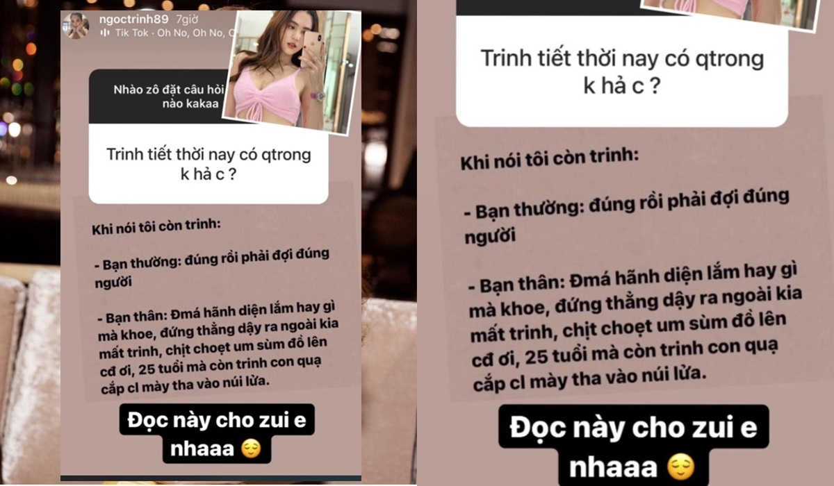 Đáng nói, Ngọc Trinh không ngại khi trả lời các câu hỏi có phần nhạy cảm mà ít ai dám phản hồi. Cụ thể khi được hỏi một câu liên quan đến vấn đề tế nhị của con gái rằng: “ Trinh tiết thời nay có còn quan trọng không hả chị!”.