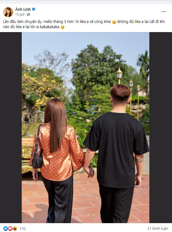 Mới đây, Ái Linh bất ngờ đăng tải hình ảnh nắm tay một người đàn ông đầy tình cảm từ phía sau. Cô nàng còn đùa rằng nếu bức ảnh đủ nghìn lượt thích thì sẽ công khai danh tính: ‘Lần đầu làm chuyện ấy. Hello tháng 3 hơn nghìn like em sẽ công khai, không đủ like em lại cất đi khi nào đủ like em lại lôi ra’.