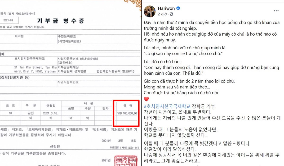 Mới đây, vào ngày 17/3, Hari Won đăng tải về việc cô đã giúp đỡ các học sinh khó khăn của ngôi trường cô đã từng học tập ở Hàn Quốc: