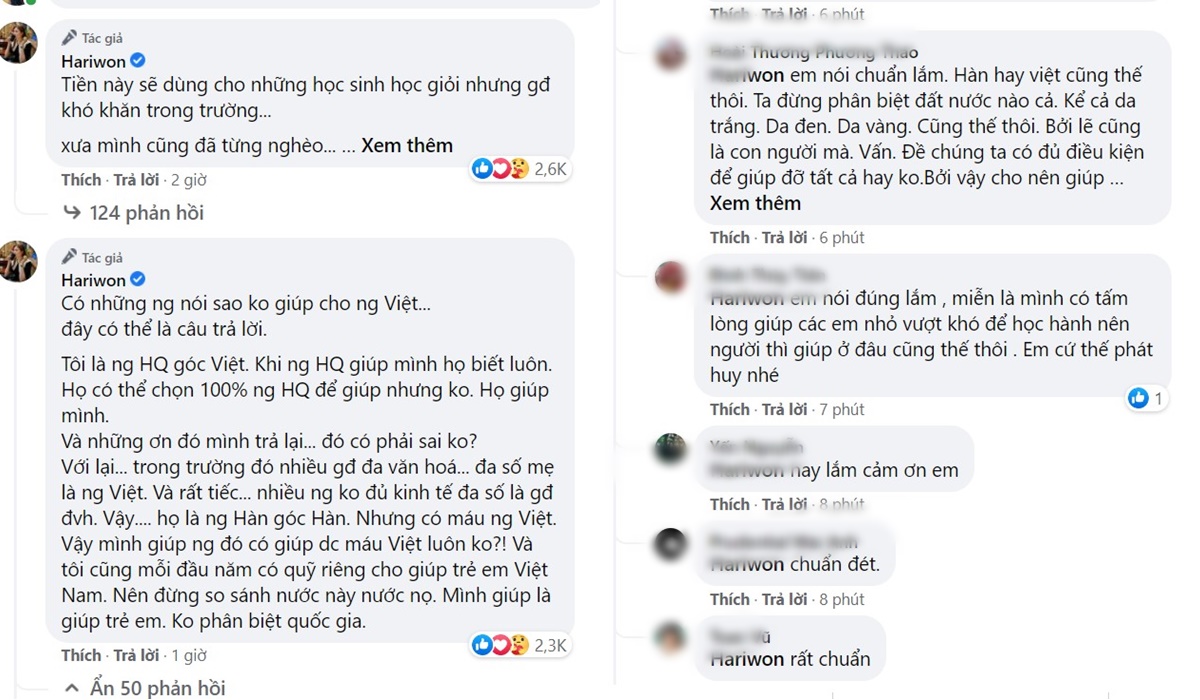 Theo đó, bà xã Trấn Thành giải thích rằng việc cô trả ơn những người Hàn Quốc đã giúp mình bằng cách trao những học bổng cho những học sinh Hàn gặp khó khăn. Hơn nữa, cô cho hay đa số các học sinh hoàn cảnh khó khăn đa phần xuất thân từ gia đình đa văn hóa trong đó có rất nhiều học sinh gốc Việt. Vì thế đây cũng là cách để cô giúp đỡ người Việt xa xứ. Hari Won cũng tiết lộ rằng cô có quỹ riêng để giúp đỡ trẻ em Việt Nam. Quan điểm giúp đỡ trẻ em của bà xã Trấn Thành là không phân biệt quốc gia.