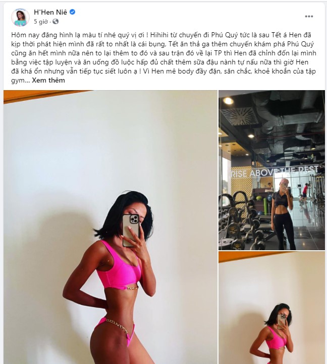 Hoa hậu hoàn vũ 2017 chia sẻ trên trang cá nhân: “Hôm nay đăng hình lạ màu tí nhé quý vị ơi ! Hihihi từ chuyến đi Phú Quý tức là sau Tết á Hen đã kịp thời phát hiện mình đã rất to nhất là cái bụng, Tết ăn thả ga thêm chuyến khám phá Phú Quý cũng ăn hết mình nữa nên to lại thêm to đó và sau trận đó về lại TP thì Hen đã chỉnh đốn lại mình bằng việc tập luyện và ăn uống đồ luộc hấp đủ chất thêm sữa đậu nành tự nấu nữa thì giờ Hen đã khá ổn nhưng vẫn tiếp tục siết luôn ạ ! Vì Hen mê body đầy đặn, săn chắc, khoẻ khoắn của tập gym lắm ạ ! Nên mong muốn tập và tập tiếp !