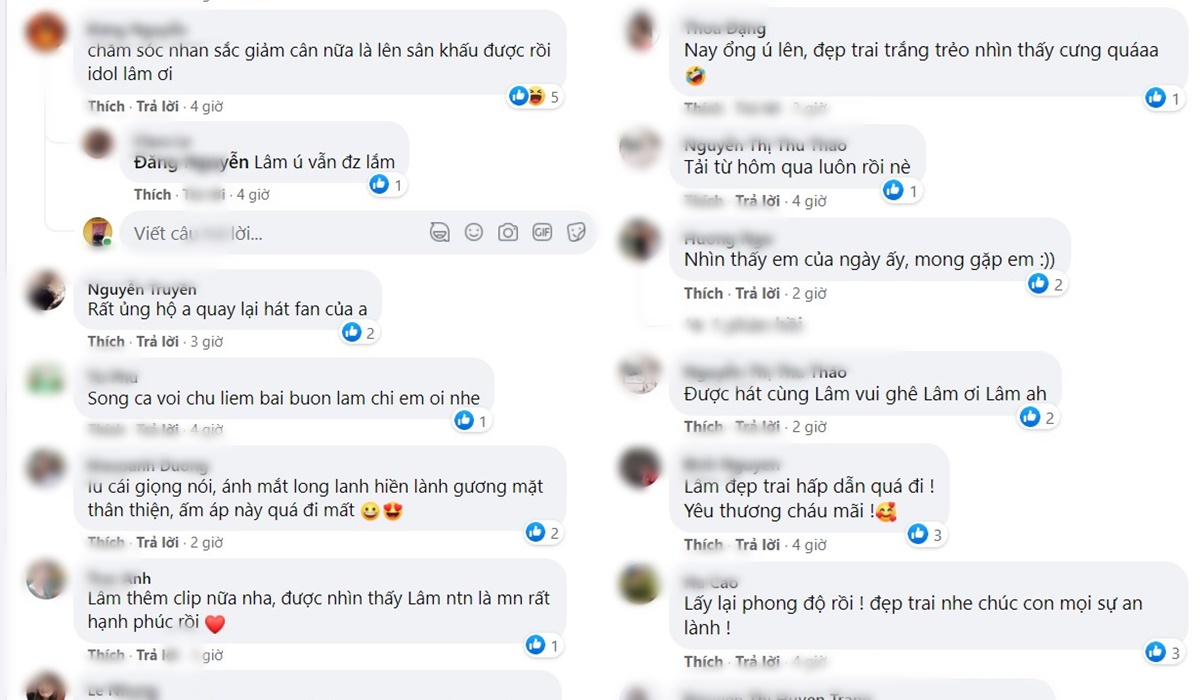 Có thể nói, người hâm mộ vô cùng vui vẻ khi Hoài Lâm xuất hiện với thần sắc vui vẻ và thể hiện sự động viên nam ca sĩ sau thời gian chịu không ít áp lực về tâm lý: “Hoài Lâm ơi ! Mạnh mẽ lên để chiến đấu với cuộc sống con nhé ! Chúc cháu luôn vui khỏe, an lành trong cuộc sống cháu nhé !”, “Nhìn thấy em của ngày ấy, mong gặp em”, “Quay lại đi em. Hát hay mà không hát uổng quá à . Luôn ủng hộ em”, “Ôi idol bao ngày mong ngóng!”.