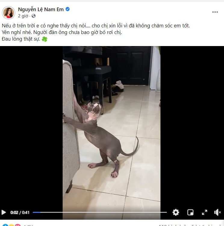 Người đẹp còn đăng tải kèm clip khoảnh khắc một chú mèo đang vui đùa. Dân tình hiểu ra ngay rằng Nam Em đang buồn rầu và đau khổ vì mất đi thú cưng.