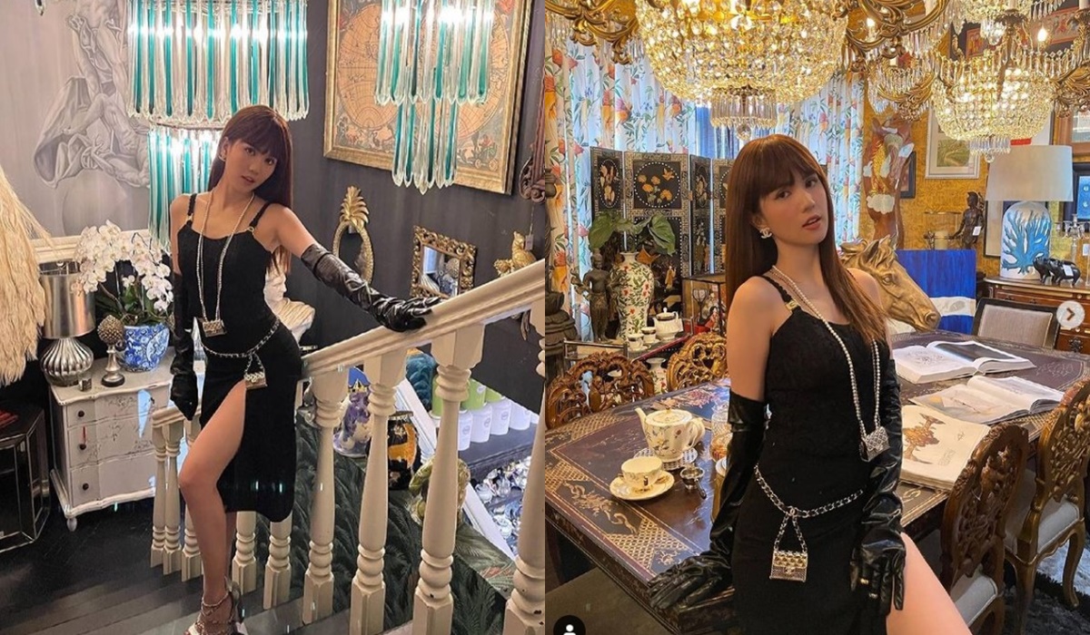 Theo đó, bộ ảnh được thực hiện trong một bối cảnh vô cùng vương giả với khung cảnh xung quanh không khác gì cung điện với những chùm đèn lung linh và hàng loạt ‘cổ vật đắt giá’. Đáng nói trong loạt ảnh này, Ngọc Trinh đã để mái bằng khoác lên mình chiếc váy body ôm sát xẻ tà đến từ thương hiệu xa xỉ Chanel. Cô nàng còn khiến ai nấy ngỡ ngàng khi sử dụng những chiếc túi mini Chanel đang là những món hàng hot biến hóa thành loạt phụ kiện như dây đeo cổ, thắt lưng. Từ đầu đến chân, Ngọc Trinh gây choáng khi tỏa ra sự sang chảnh với một cây toàn đồ hiệu, không quả danh ‘yêu nữ hàng hiệu’.