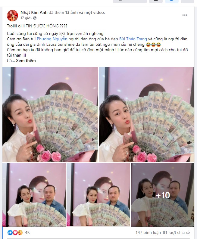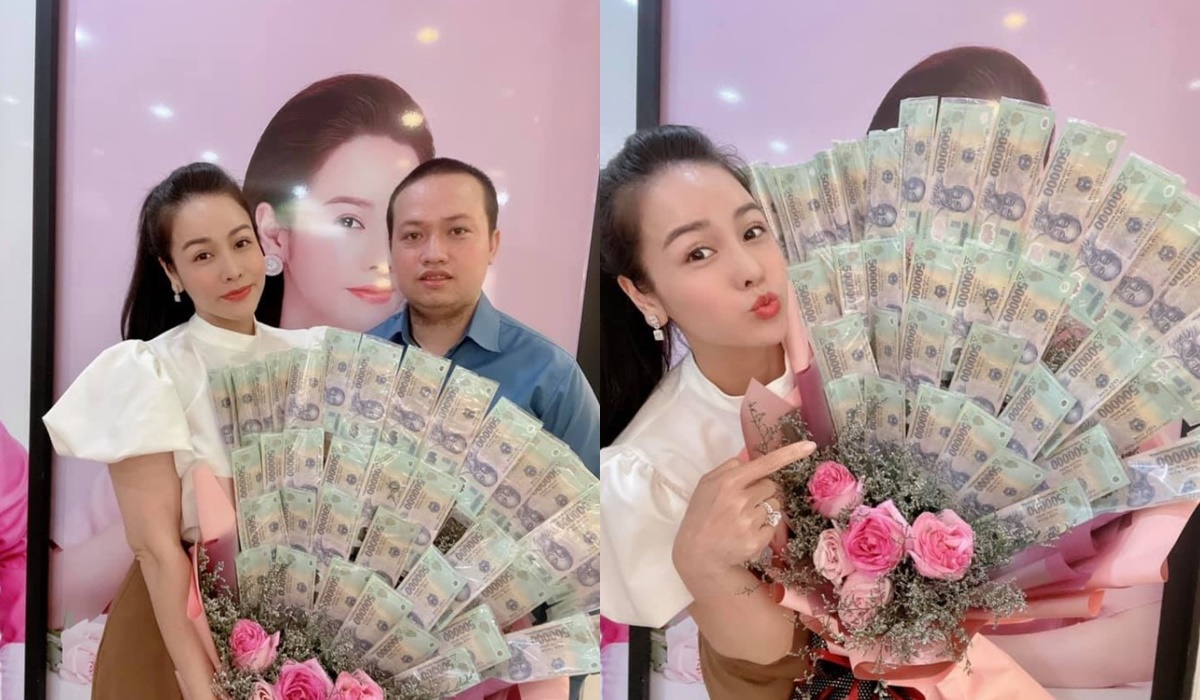 Theo đó, nữ diễn viên được một đồng nghiệp trong hệ thống mỹ phẩm của mình cũng là chồng của 1 một người bạn thân thiết tặng cho một bó hoa vô cùng đặc biệt. Bó hoa mà Nhật Kim Anh nhận được khiến ai nấy cũng choáng ngợp khi chứa đầy ắp hàng chục tờ 500.000 đồng. Thậm chí nhiều người còn nhẩm tính bó hoa của Nhật Kim Anh có giá ‘sương sương’ cũng đến 20 triệu đồng.